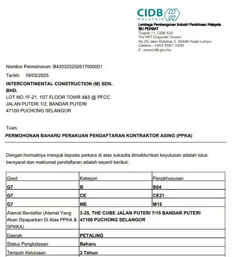 近日,經(jīng)馬來西亞建筑工業(yè)發(fā)展局(CIDB)批準(zhǔn),合景建設(shè)集團(tuán)有限公司全資子公司洲際建設(shè)(馬來西亞)有限公司取得馬來西亞最高等級G7承包商資質(zhì),包括土木工程(CE21)、土建工程(B04)、機(jī)電工程(M15)以及各種機(jī)械工程等多項內(nèi)容。這是合景建設(shè)在馬來西亞建筑資質(zhì)領(lǐng)域的重大突破,意味著公司在智慧建筑領(lǐng)域的技術(shù)實力、屬地化服務(wù)能力及行業(yè)影響力獲官方權(quán)威認(rèn)可。